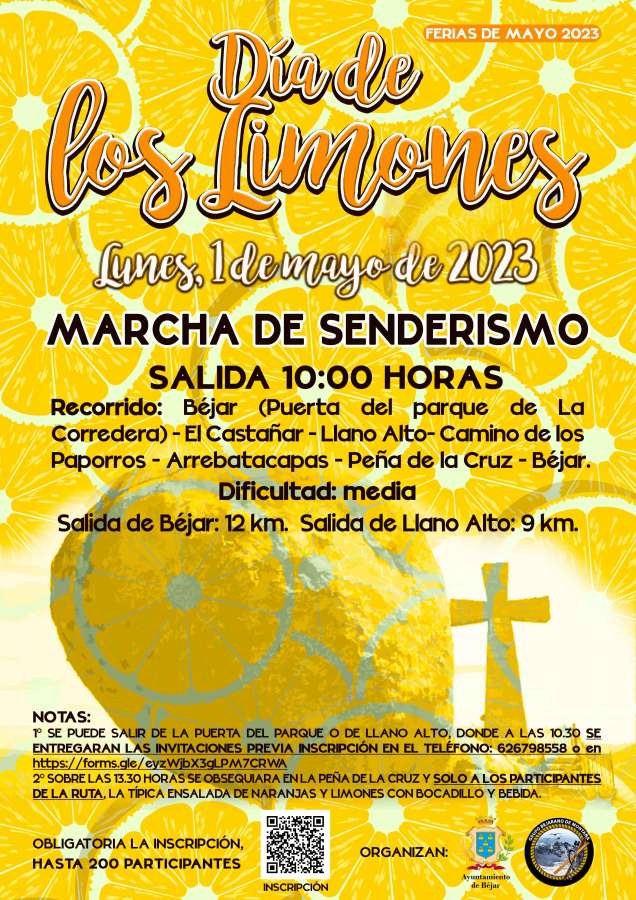 - TRADICIONAL DÍA DE LOS LIMONES, marcha de senderismo de forma totalmente gratuita que comenzará a las 10 horas en la puerta del Parque Municipal de La Corredera y continuará por El Castañar - Llano Alto- Camino de los Paporros - Arrebatacapas - Peña de la Cruz y de vuelta a Béjar. La dificultad de la marcha es media con un total de 12 km si se sale de Béjar y 9 km si la salida es de Llano Alto, sobre las 13:30 h los participantes de la ruta serán obsequiados con la típica ensalada de naranjas y limones con bocadillo y bebida en la Peña de la Cruz. La inscripción es gratuita y se puede realizar llamando al 626798558 o a través de este enlace