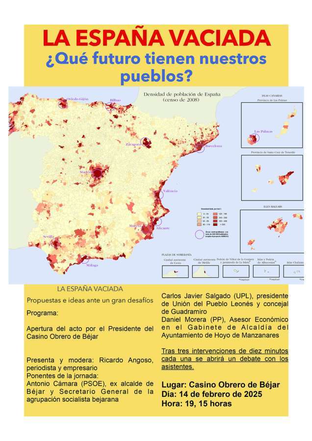 El Casino Obrero de Béjar será escenario este viernes 14 de febrero de un debate sobre La España Vaciada, un tema de gran relevancia para Béjar y su entorno. El evento comenzará a las 19:15 en la sala de exposiciones de la entidad.