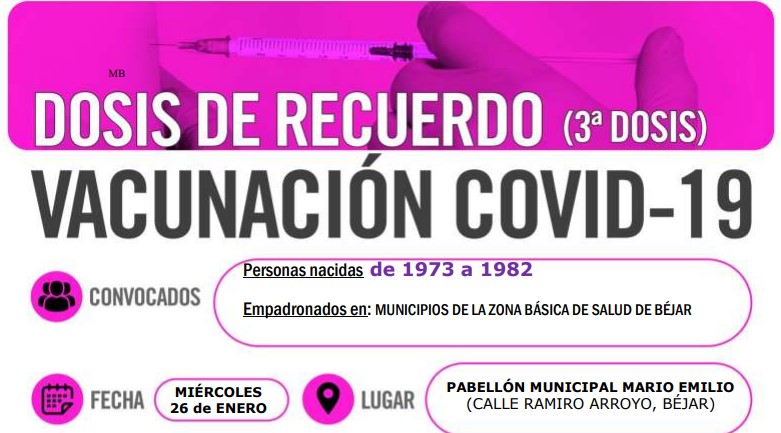 Los nacidos entre los años 1973 y 1982, pertenecientes a la zona de salud de Béjar podrán ponerse la vacuna —dosis de recuerdo — el próximo miércoles, 26 de enero. La campaña cubre a las personas empadronadas en la zona básica de salud de Béjar. Tendrán que ir de nuevo al pabellón municipal de Mario Emilio, en la calle Ramiro Arroyo.