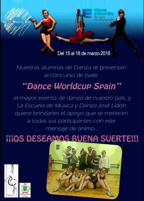 Algunas de las alumnas de la escuela de música y danza de Béjar participarán la próxima semana a un concurso internacional de danza en Burgos. El concurso, Dance WorldCup Spain, ofrece la posibilidad de participar con cualquier estilo de danza.