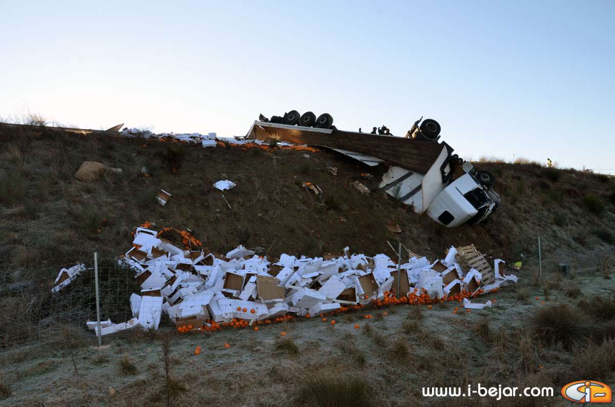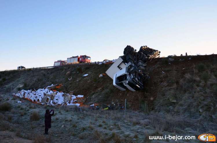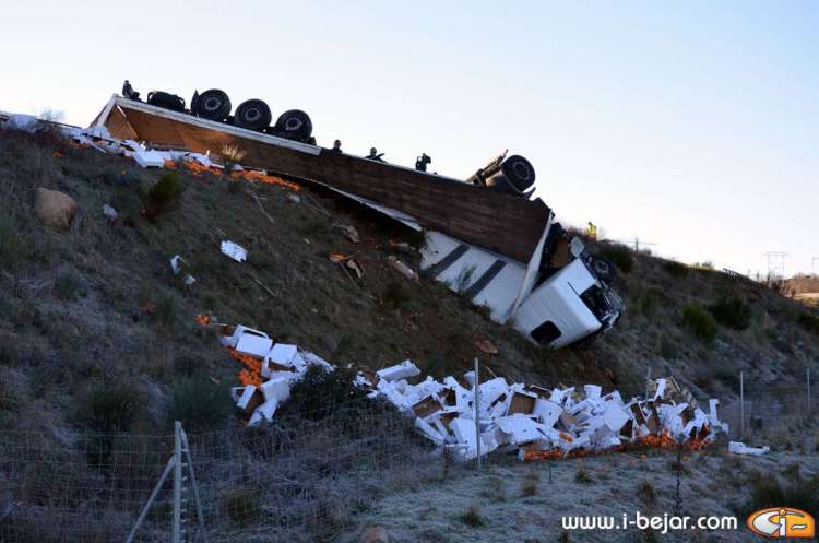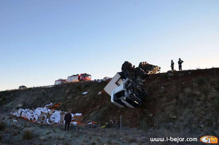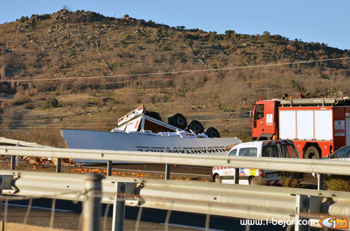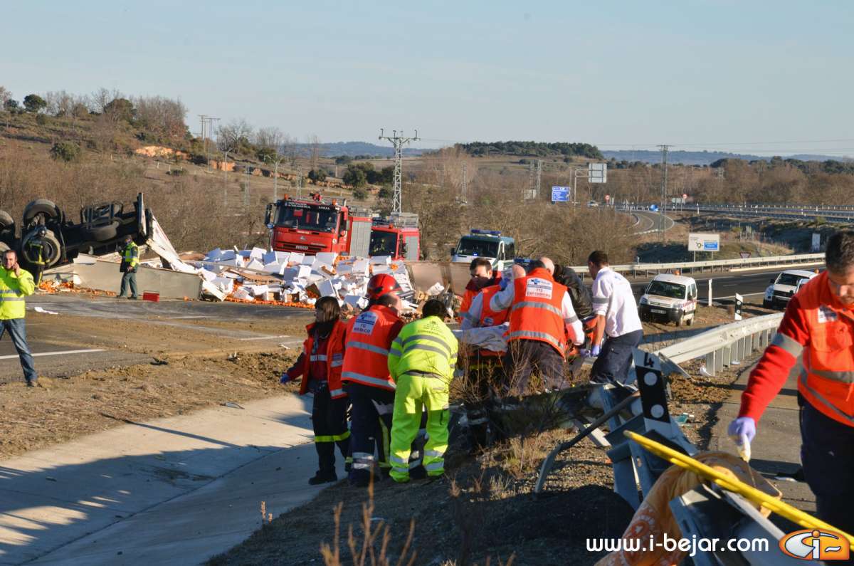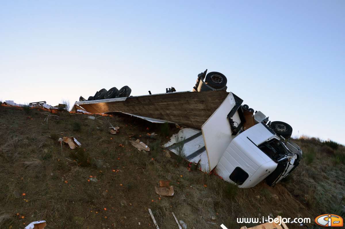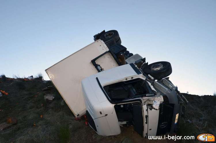 El camión colisionó con uno de los guardarraíles del paso sobre la carretera que lleva a la localidad de la Nava de Béjar, donde salió despedido de la cabina el herido más grave, que conducía el vehículo. sus acompañantes dormían en la cabina del Camión. A partir de aquí se inicio el violento vuelco, que terminó con la cabina colgada sobre el terraplén del carril contrario, solo sujeta por el remolque y parte de la carga y después de haber rodado y deslizado más de 200 metros.