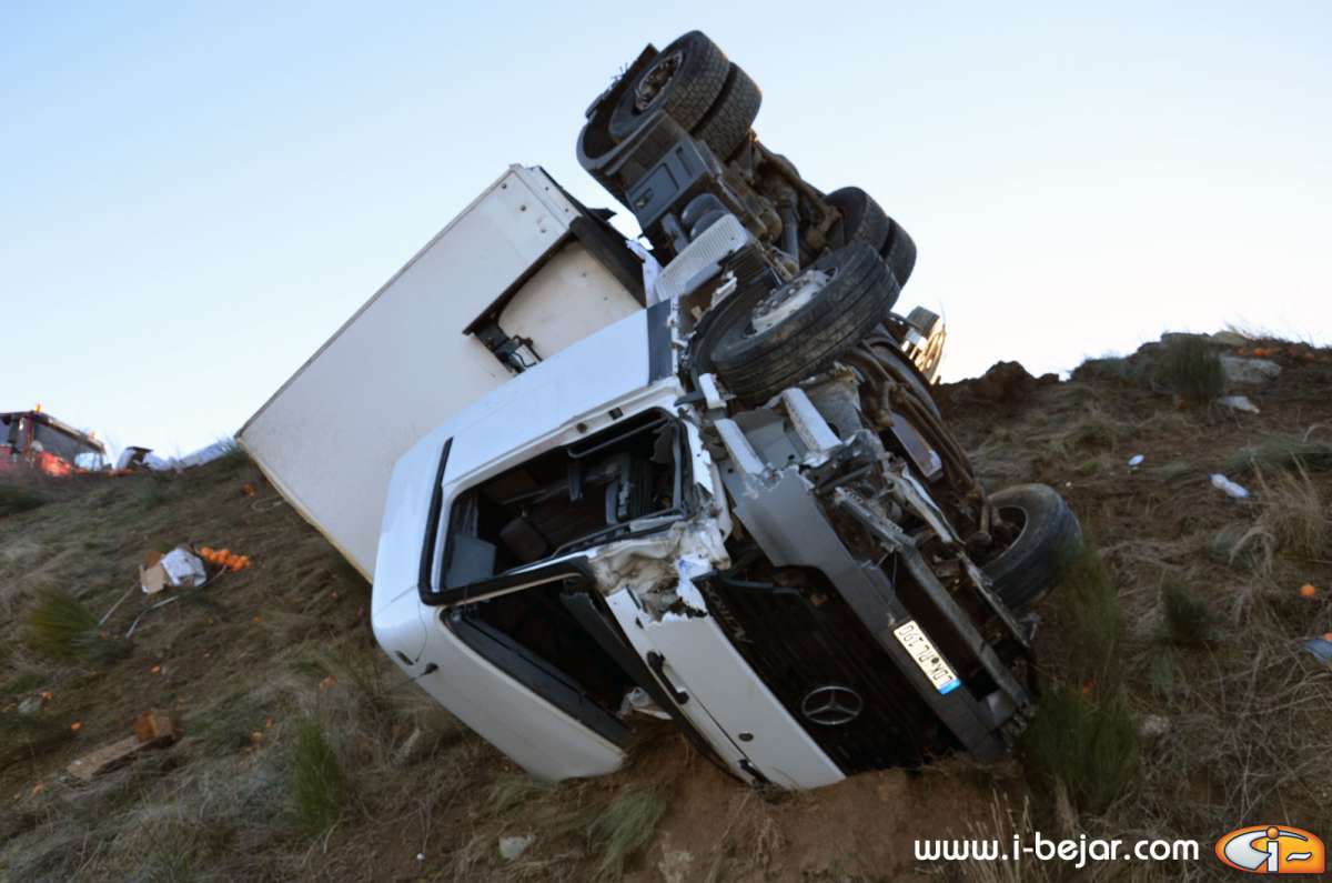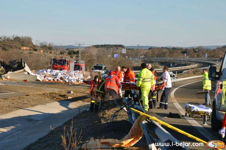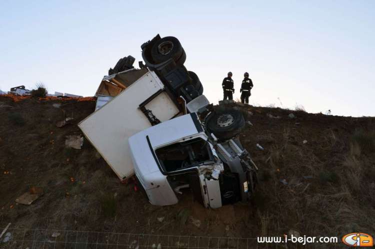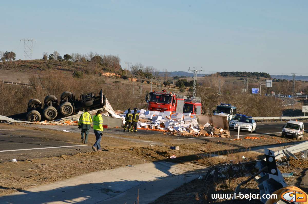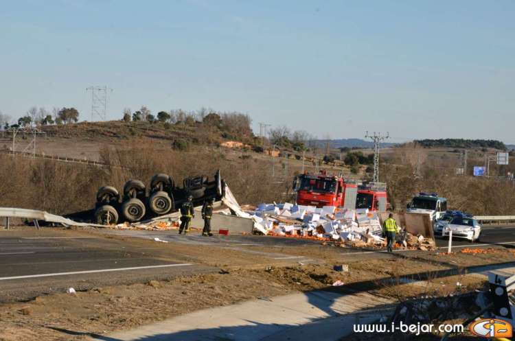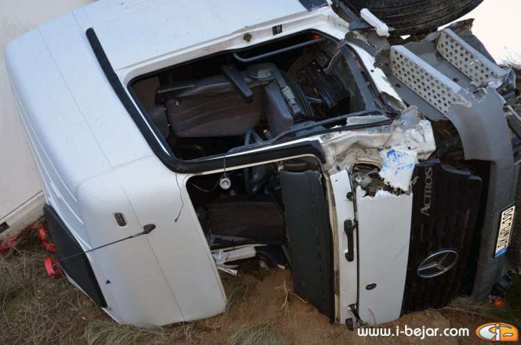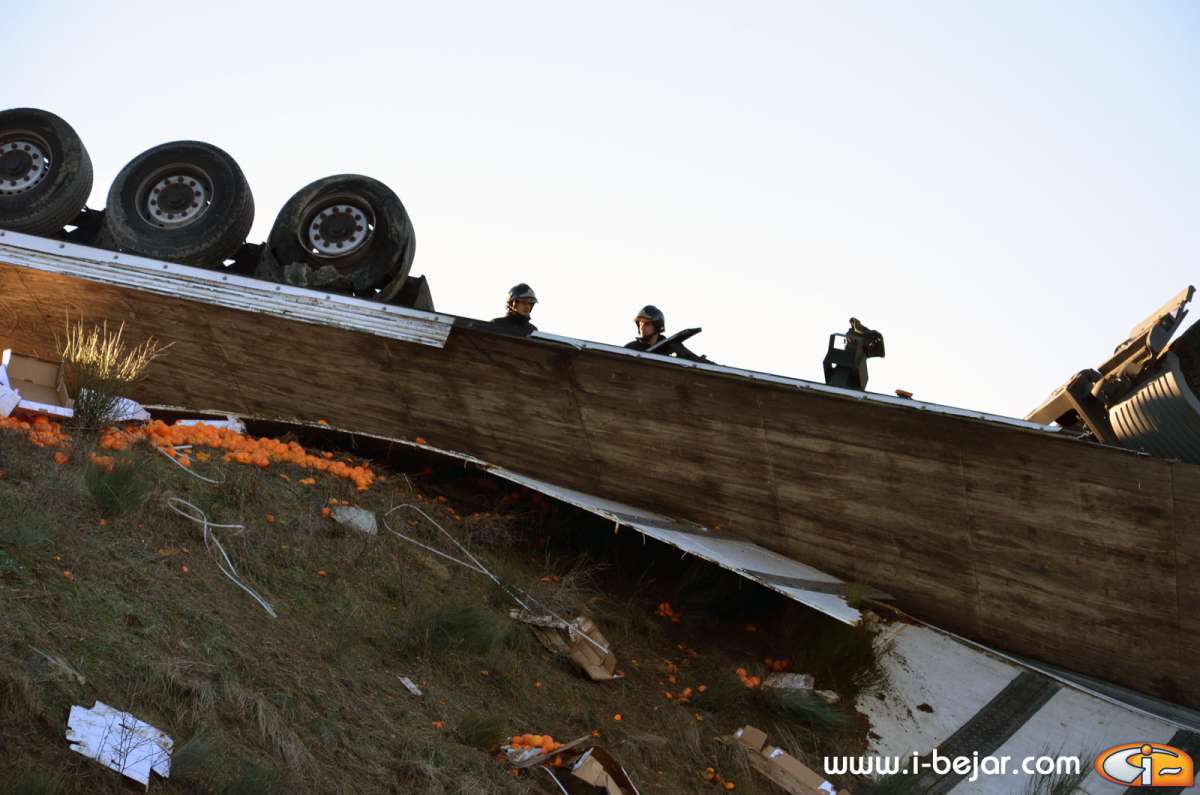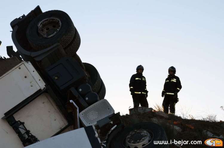El camión colisionó con uno de los guardarraíles del paso sobre la carretera que lleva a la localidad de la Nava de Béjar, donde salió despedido de la cabina el herido más grave, que conducía el vehículo. sus acompañantes dormían en la cabina del Camión. A partir de aquí se inicio el violento vuelco, que terminó con la cabina colgada sobre el terraplén del carril contrario, solo sujeta por el remolque y parte de la carga y después de haber rodado y deslizado más de 200 metros.
