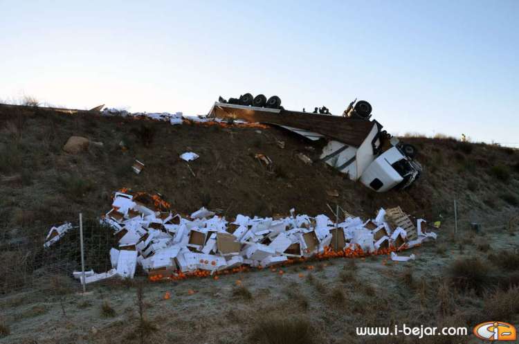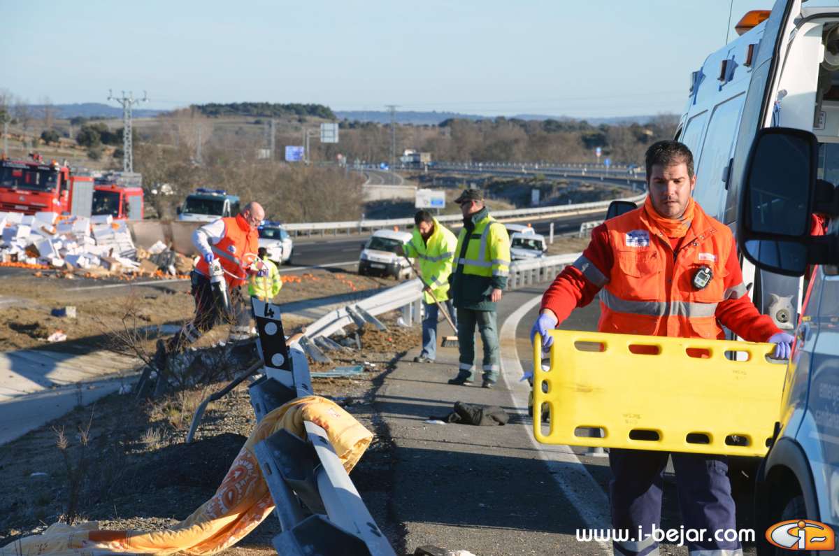 Un fallecido y otros dos heridos de diversa consideración, es el balance del accidente que tenía lugar esta mañana. Un camión tráiler cargado de naranjas y miel, volcó a las 9 de la mañana en la autovía A66 a la altura de la localidad de Nava de Béjar. Aunque las causas del accidente están por determinar todo apunta a que el conductor del tráiler, de nacionalidad alemana se hubiera quedado dormido. La carga de naranjas y miel era transportada desde el Algarve (Portugal) con destino a la Cruz roja Alemana.