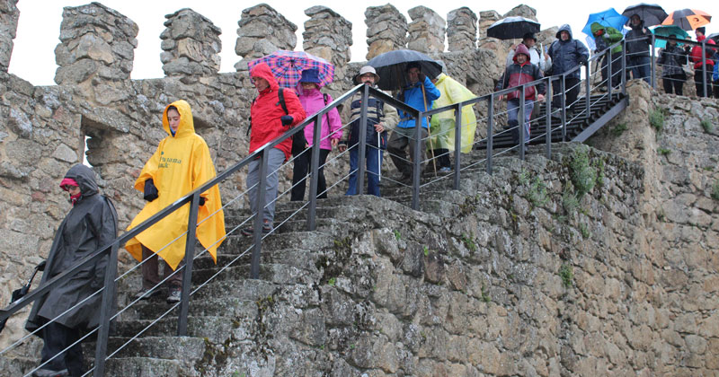 El día amaneció con nubes que se fueron acumulando hasta empezar a descargar a las 09:30, hora de la salida. Completada las inscripciones y la entrega de materiales en el museo, los senderistas, acompañados por la Policía Municipal, alcanzaron el parque de La Antigua para coronar las murallas y salir por la Puerta de la Traición en dirección sur y paraguas en mano.