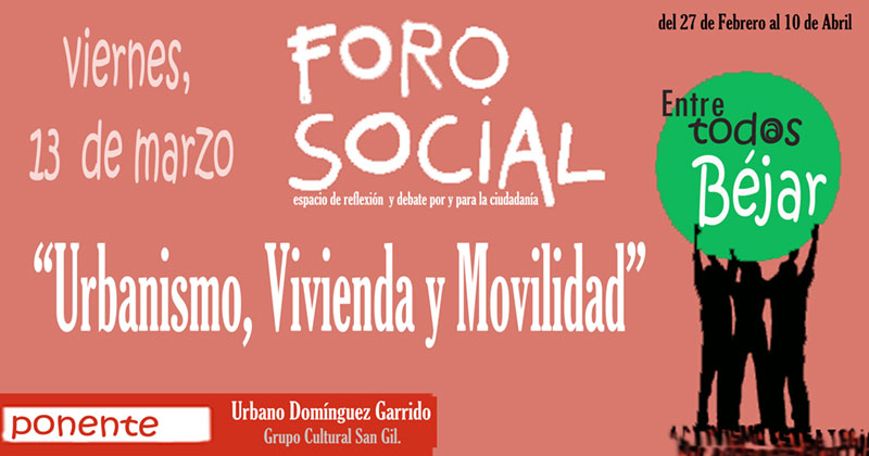 El 13 de Marzo, el recién creado Foro Social continuará su serie de debates públicos con la tercera sesión en la que se debatirá sobre "Urbanismo, Vivienda y Movilidad".