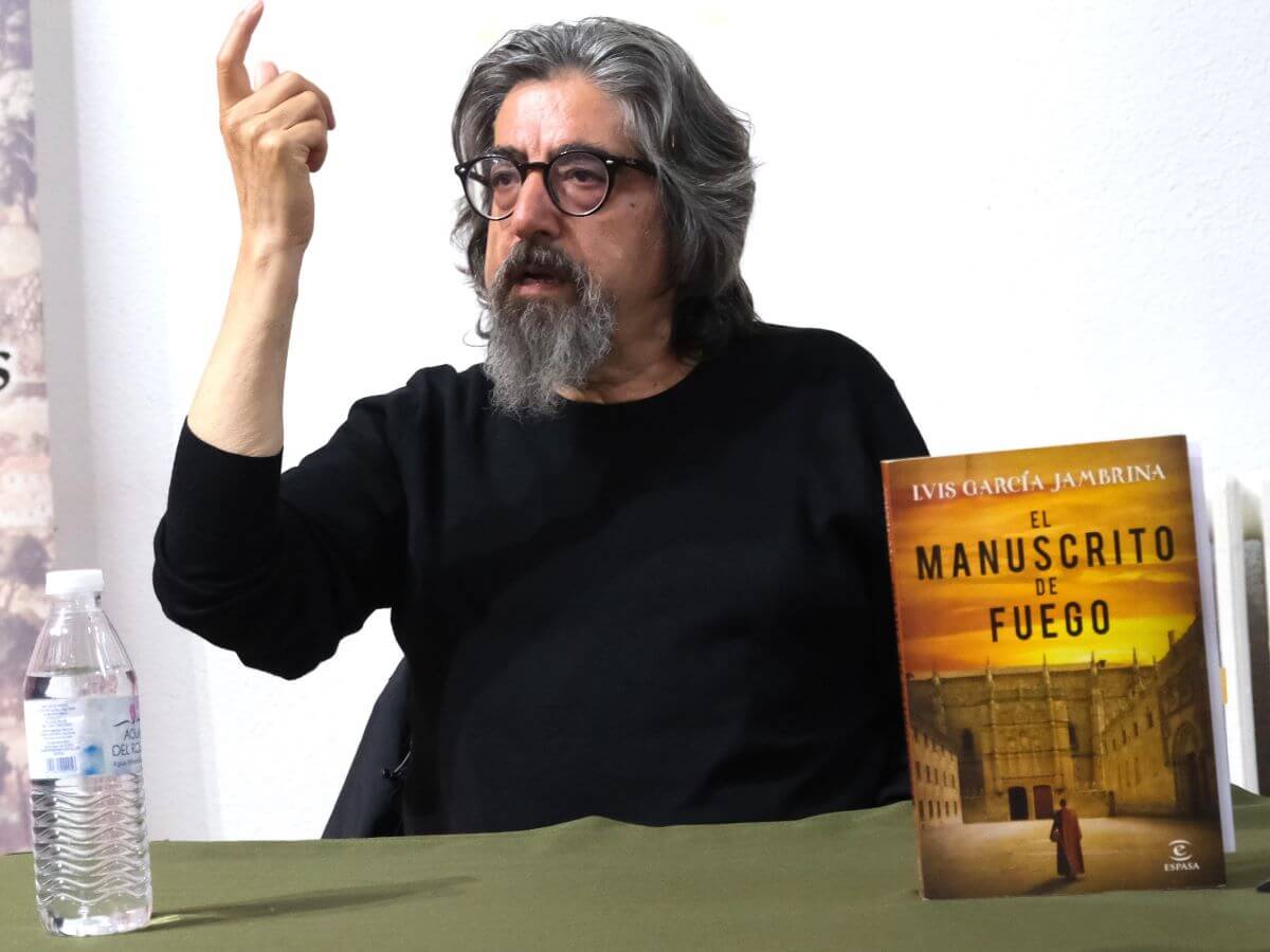 Tras la visita por algunas dependencias del emblemático edificio como la espléndida biblioteca y el legado Hernández Girbal, comenzó el Club de Lectura, una actividad dirigida por Iván Parro en el que se comentaron detalles referentes al argumento, personajes, emplazamientos y otros muchos de la novela El manuscrito de fuego, cuyo eje central es la muerte del bejarano don Francés de Zúñiga, escritor y bufón en la corte del emperador Carlos V. Varios de los capítulos del libro suceden en Béjar, mientras el pesquisidor y escritor de La Celestina, Fernando de Rojas, desentraña las causas por las que el Zúñiga fue muerto a cuchilladas en una calle de Béjar. Los lectores tuvieron la oportunidad de realizar preguntas a García Jambrina, centrándose, sobre todo, en su interés por la ciudad textil, un conocimiento debido a la amistad entre el autor y José Antonio Sánchez Paso.