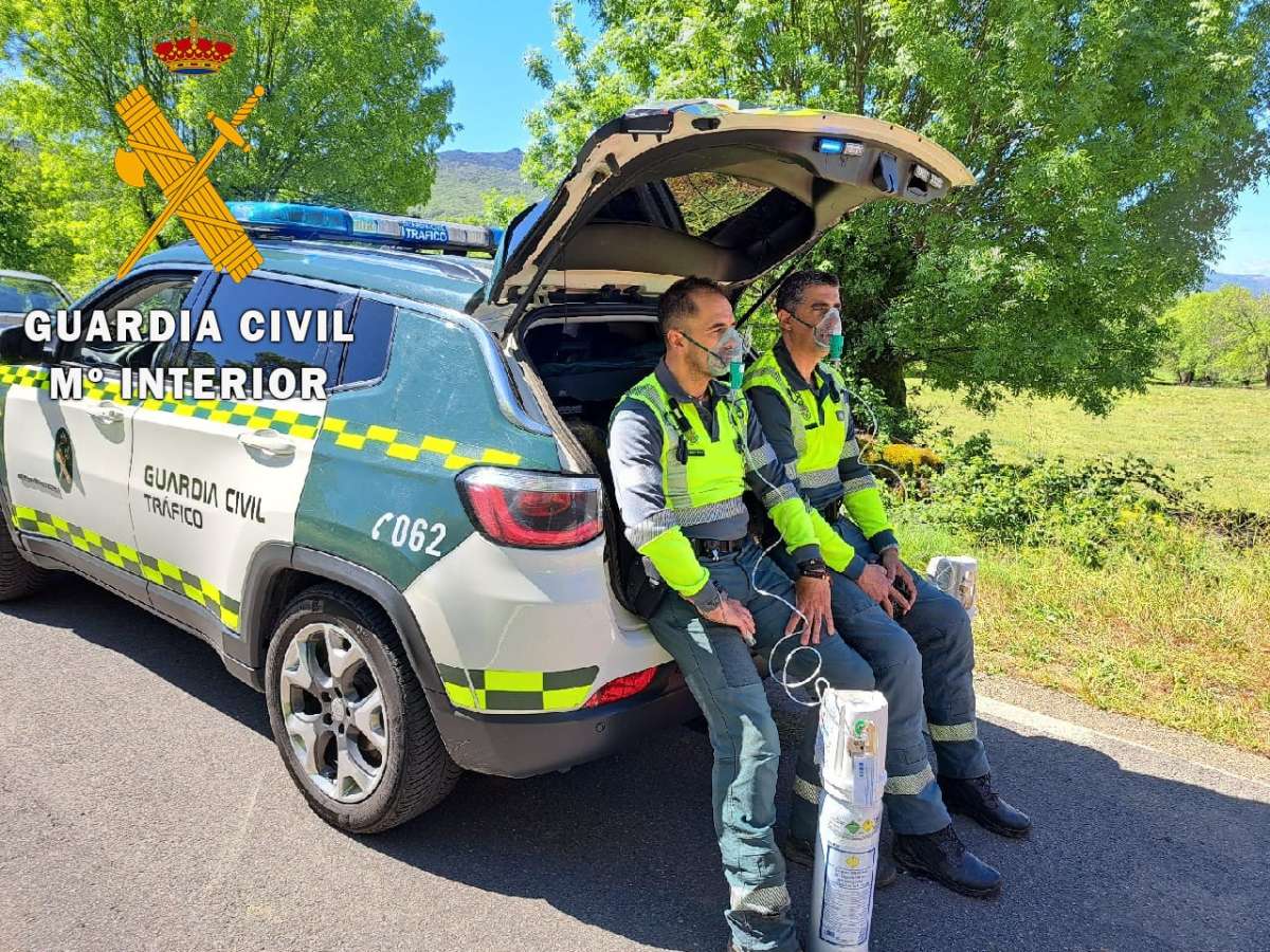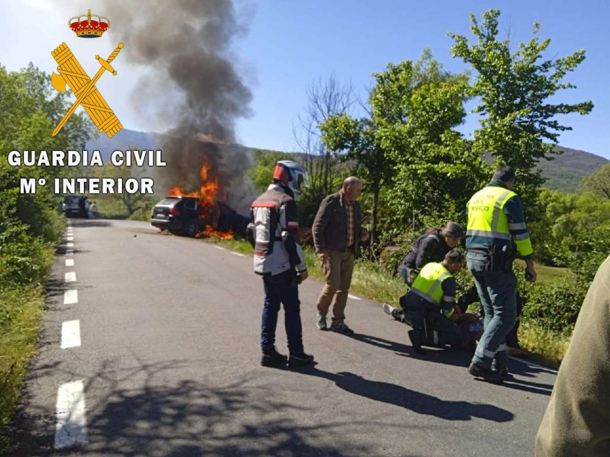 Los dos guardias civiles se aproximaron con celeridad al vehículo accidentado que estaba empezando a arder, percatándose que en su interior se encontraba, en el asiento del conductor, una persona atrapada en estado semiconsciente.
