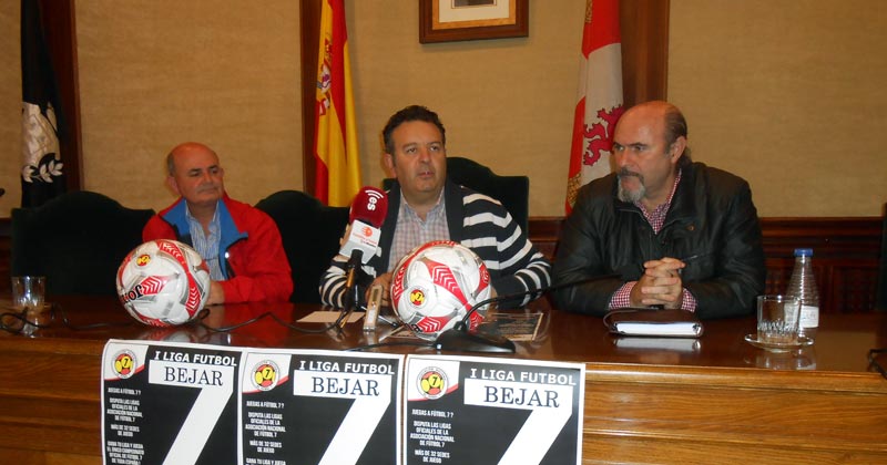 El concejal de deportes, Raúl Hernández, junto con Javier Zapatera, delegado provincial y tesorero de la Asociación Nacional de Futbol 7, y Javier Nevado, coordinador de Béjar, presentaron las bases para participar en la Liga Fútbol 7 de la Asociación Nacional de Futbol 7.
