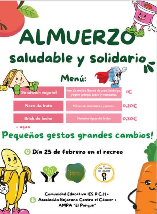 Además, el martes 25 de febrero a las 11:10 h, el instituto celebrará su primer almuerzo saludable y solidario. La iniciativa, impulsada por la Comunidad Educativa del centro, tiene un doble propósito: fomentar hábitos saludables y recaudar fondos para la Asociación Bejarana contra el Cáncer.