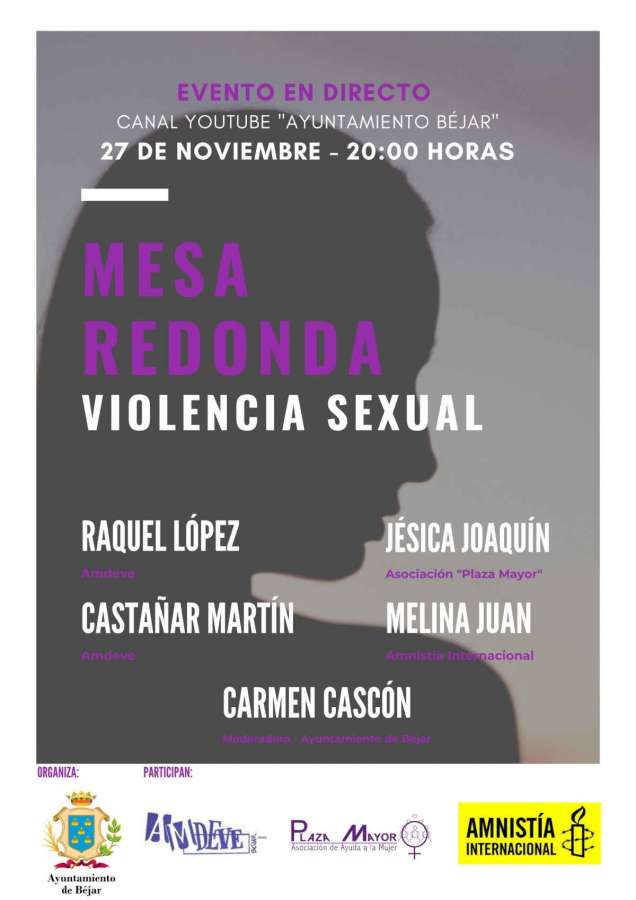 El viernes 27 de noviembre tendrá lugar una mesa redonda en directo a través del canal de Youtube “Ayuntamiento Béjar” a las 20 horas, con el tema “Violencia sexual” en la que intervendrán las asociaciones AMDEVE, “Plaza Mayor” y “Amnistía Internacional”.