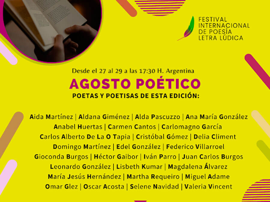 Este Agosto Poético se celebra en el marco del Festival Internacional de Poesía Letra Lúdica como un espacio de encuentro entre poetisas, poetas y amantes de la poesía para compartir versos, prosa, sonetos y nuevas estructuras poéticas.