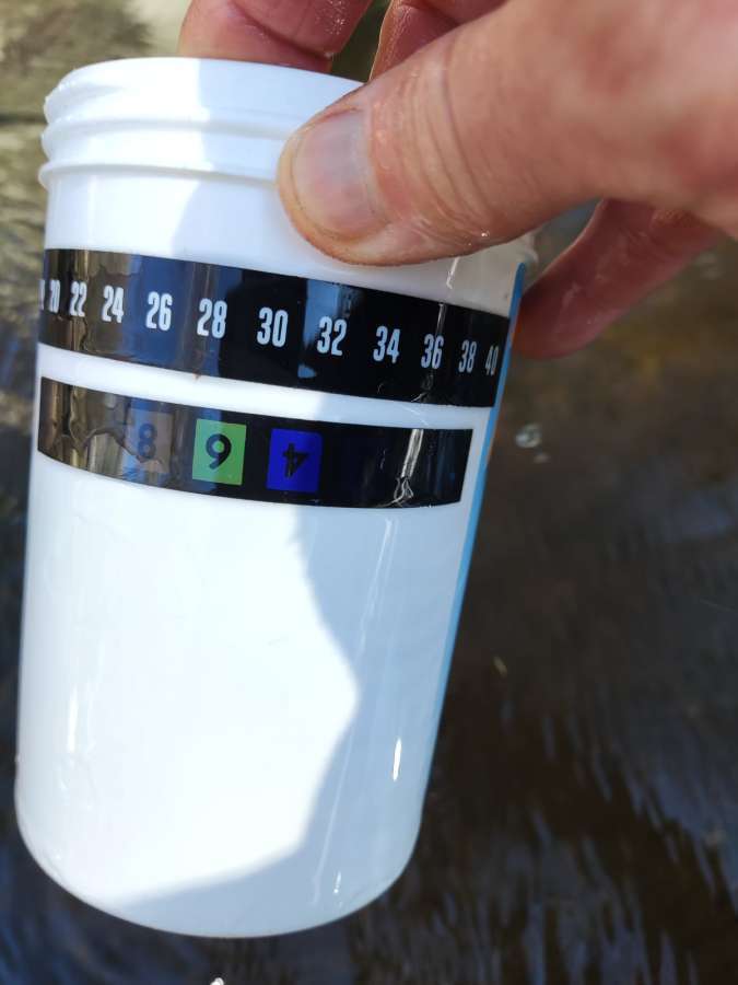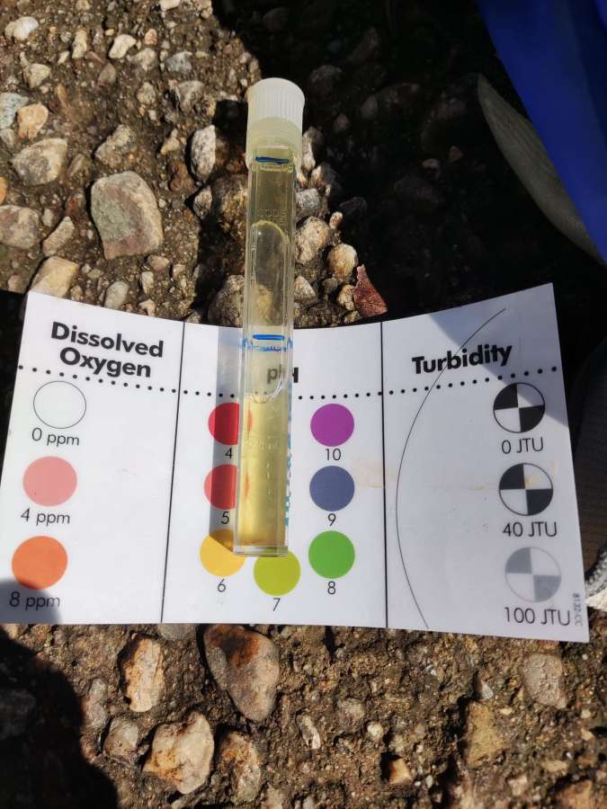 Una temperatura de 7ºC, pH de 6.5 (neutro), un nivel de Oxígeno disuelto de 8 ppm, índice de Nitratos entre 0 y 1, posiblemente debido al arrastre de las lluvias de la noche anterior, razón ésta por la que en el análisis de la turbidez se apreciaba tomada el agua. Se realizó un muestreo de macroinvertebrados, que aún con la temperatura tan baja del agua sorprendió por la presencia de alguna larva de efémeras, tricópteros y dípteros.