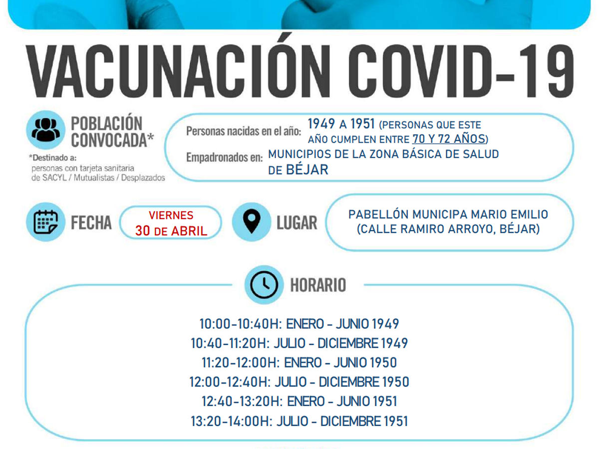 Este viernes, 30 de abril, desde el Sacyl se convoca a todos los ciudadanos pertenecientes a la Zona Básica de Salud de Béjar que hayan nacido en 1949, 1950 y 1951 (personas que este año cumplen entre 70 y 72 años) para recibir la primera dosis de la vacuna de la Covid-19.