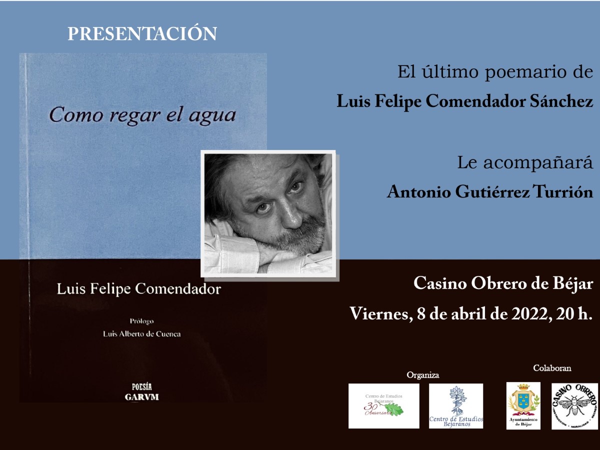 El próximo viernes, 8 de abril, a las ocho de la tarde tendrá lugar en el Casino Obrero de Béjar la presentación del último poemario del escritor bejarano Luis Felipe Comendador titulado "cómo regar el agua".