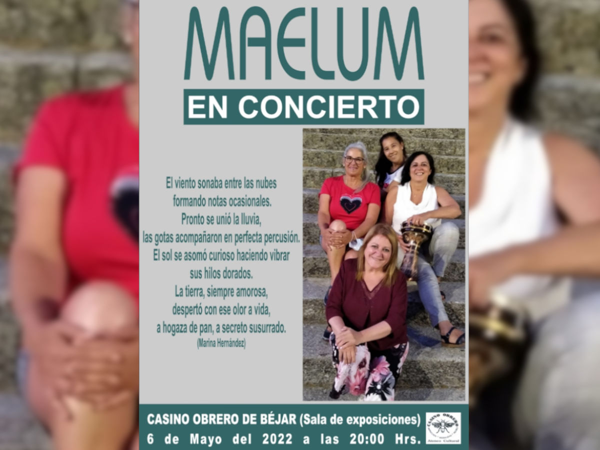 El grupo de voz y percusión formado por Elena, Marili, Lourdes y Marina, "Maelum", actuará en Béjar el próximo viernes. Cuatro mujeres que crearon el grupo con la idea de hacer música tradicional pero que, debido a la “imprevista” disposición de tiempo de confinamiento por la pandemia, pudieron explorar otras líneas musicales y descubrir “todo un mundo de posibilidades” en el mundo de la música como son las canciones de autor con las que conforman actuaciones como la que tendrá lugar en el Casino Obrero. Poesías para ser interpretadas, canciones fronterizas con nuestros vecinos portugueses o canción hispanoamericana.