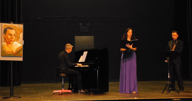 Comenó el concierto con la obra al piano de Jon Liechty llamada "Pintada está mi casa", como puedes imaginar, dedicado al poema "Canción última". Se aprecia muy bien en esta composición las dos sensaciones que se transmiten en el poema, el calor familiar mientras "el odio se amortigua detrás de la ventana". Jon es natural de Indiana, anglosajón, pero habla perfectamente español, captando perfectamente el sentido del poema.