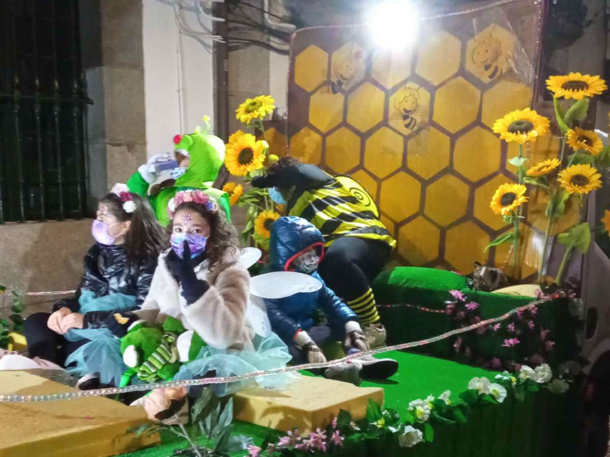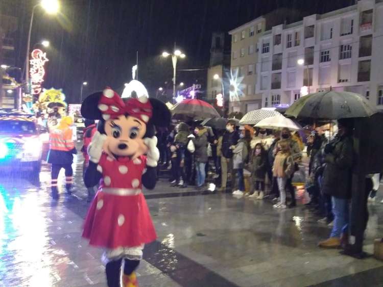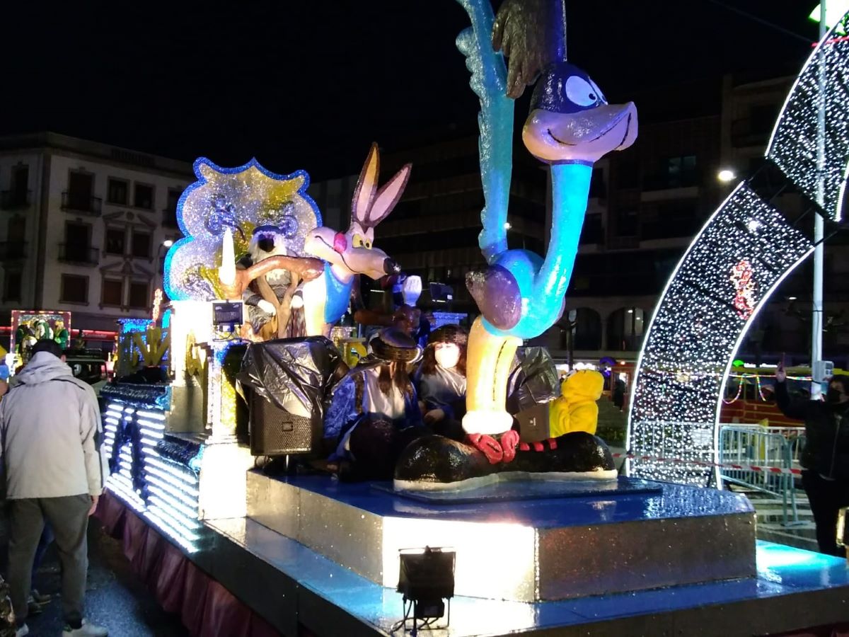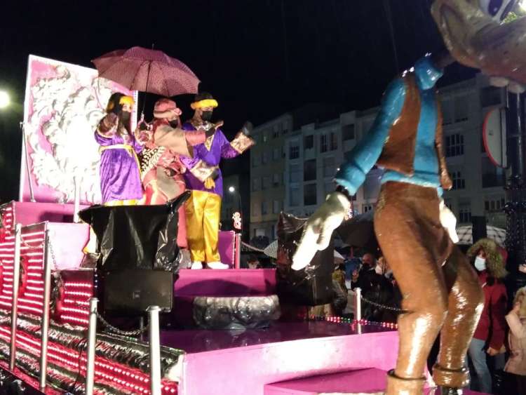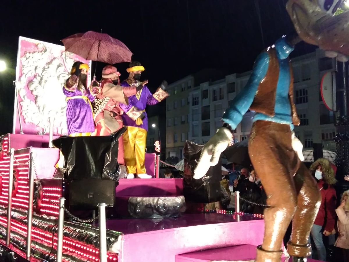 La lluvia acompañó durante casi la totalidad del recorrido —cayendo copiosa pero intermitentemente— a las peñas y colectivos que conforman la comitiva real en Béjar. Tal y como estaba previsto, sus majestades no pudieron lanzar caramelos a los niños y a los asistentes a la misma, como medida de precaución para evitar contagios.