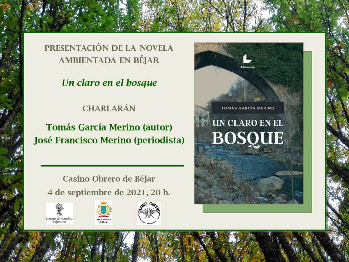 El Centro de Estudios Bejaranos comienza las actividades culturales del mes de septiembre con la presentación de un libro externo, la primera novela del bejarano Tomás García Merino, "Un claro en el bosque". La actividad tendrá lugar en la sala de conferencias y exposiciones del Ateneo Cultural "Casino Obrero” de Béjar el sábado 4 de septiembre a las 20 horas. Acompañará al autor el periodista José Francisco Merino.