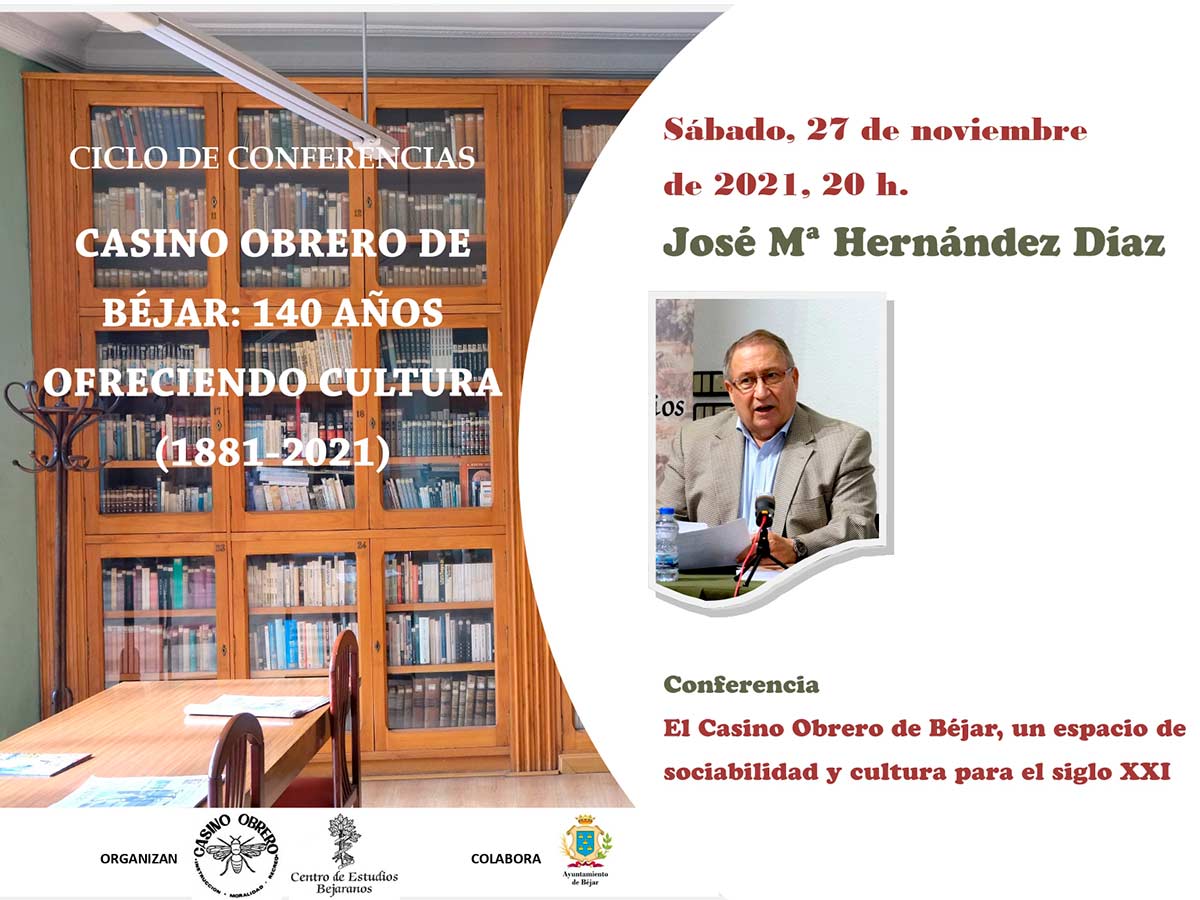 Mañana sábado, 27 de noviembre, y continuando con el ciclo de conferencias organizado por el Casino Obrero de Béjar y el Centro de Estudios Bejaranos en conmemoración de los 140 años de la fundación de esta institución cultural, intervendrá José María Hernández Díaz. Su propuesta versará sobre "El Casino Obrero de Béjar, un espacio de sociabilidad y cultura para el siglo XXI". Será en el Salón de Actos y Conferencias a las 20 h.