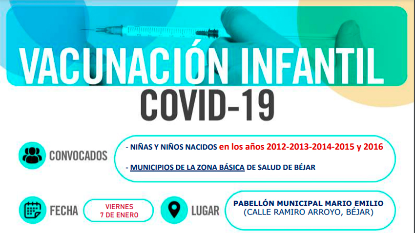 La Junta de Castilla y León continúa con la vacunación en Béjar para los menores de los municipios pertenecientes a la zona básica de salud de Béjar, que hayan nacido en los años 2012 y 2016.