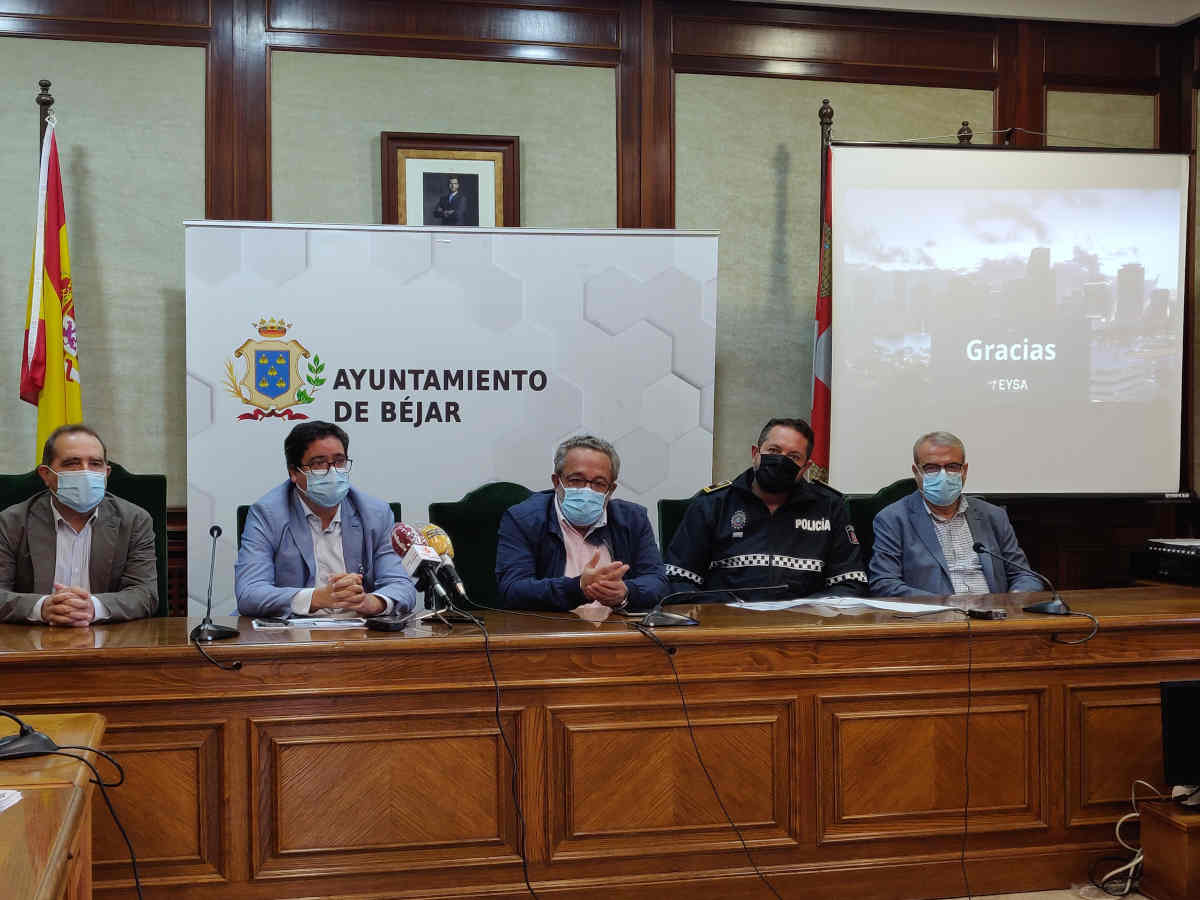 El primer teniente de alcalde del Ayuntamiento de Béjar, José Luis Rodríguez Celador, presentó, junto a José Antonio Sánchez, jefe de la Policía Local de Béjar, y los representantes de la empresa EYSA, Carlos Feced y Emilio Calvarro, los nuevos parquímetros del estacionamiento regulado de vehículos ORA, que ya se han instalado en la ciudad.
