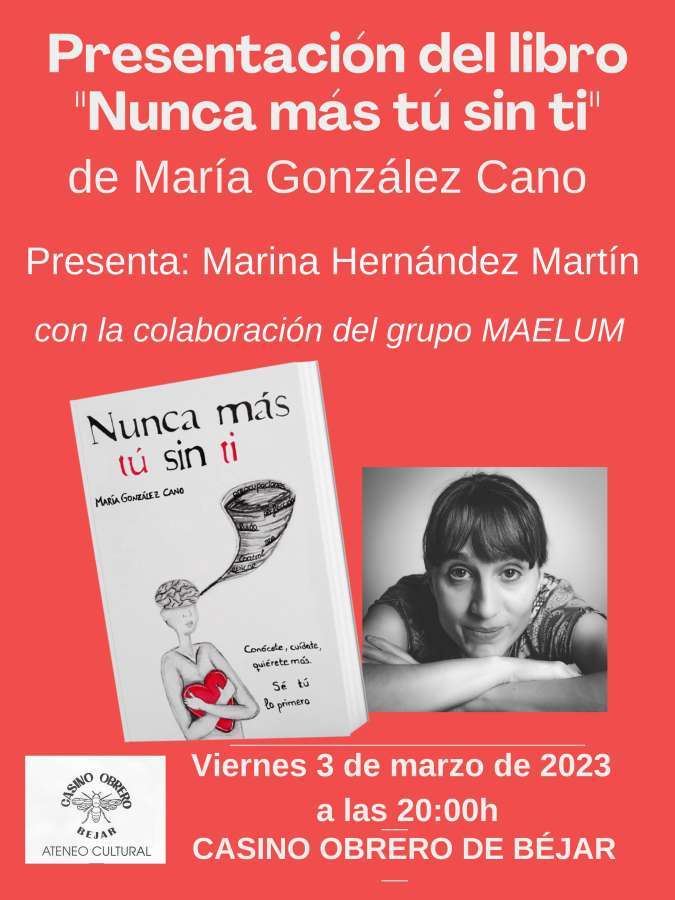 La escritora, natural de Béjar, María González Cano, presentará el libro "Nunca más tu sin ti", en el ateneo cultural, Casino Obrero de Béjar. En el acto de presentación intervendrá la también autora bejarana, Marina Hernández Martín, con la colaboración del grupo Maelum.