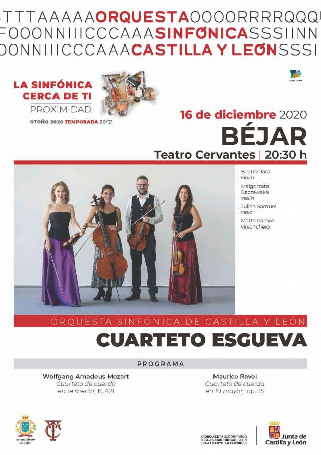 La cita será en el Teatro Cervantes a las 20:00 h en la que el Cuarteto Esgueva ofrecerá dos interpretaciones del 'Cuarteto de cuerda en re menor, K. 421', de Wolfgang Amadeus Mozart, y 'Cuarteto de cuerda en fa mayor, op. 35', de 'Maurice Ravel', con Beatriz Jara y Malgorzata Baczewska (violines), Julien Samuel (viola) y Marta Ramos (violonchelo).