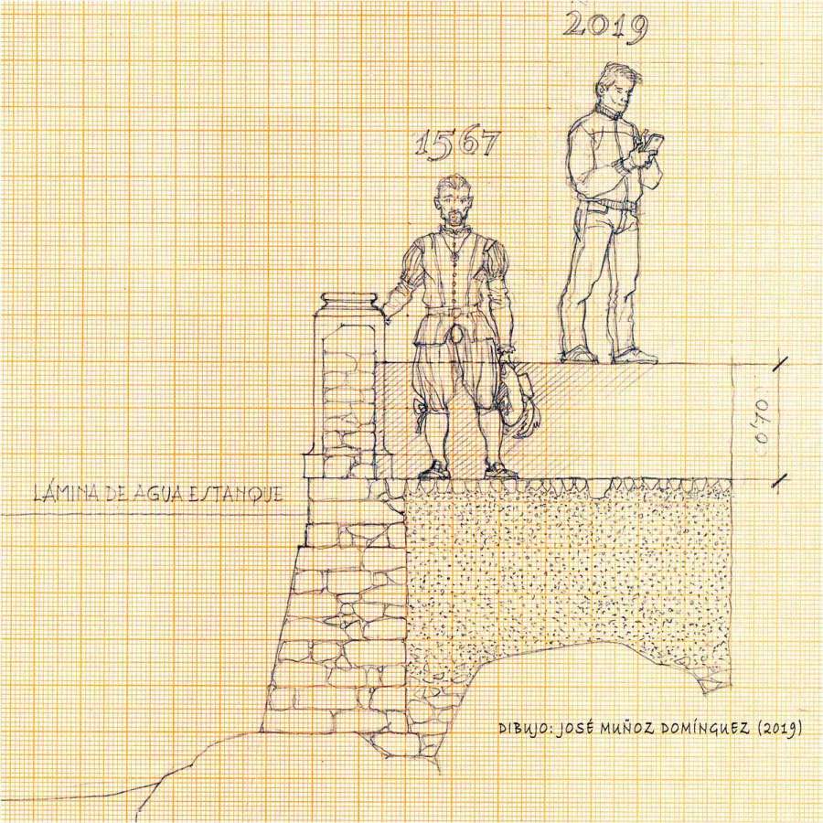 Por otra parte, las condiciones del paseadero y pretil sur del estanque (también de la parte este, donde se produjeron los derrumbamientos de la década de los noventa), distan mucho de ser las originales, pues el nivel holladero actual se encuentra elevado sobre el antiguo pavimento entre 50 y 70 cm, como se aprecia en las imágenes que acompañan a esta información. Un relleno nada despreciable que en tiempo de lluvias se satura y provoca empujes indeseados sobre los pretiles, obligados a servir como muro de contención de tierras –y de aguas– cuando su fábrica no fue dimensionada para ello: si se pudiera recuperar el nivel original del paseadero, no sólo tendríamos ante nosotros el aspecto del lugar en el siglo XVI, sino que el público disfrutaría de mayor seguridad en su visita (gracias a un pretil de 1,10 m frente a los escasos 30 cm actuales en el ángulo sureste del estanque) y, sobre todo, se evitarían daños como el que ahora denuncia la plataforma, con el consiguiente ahorro para el erario público.