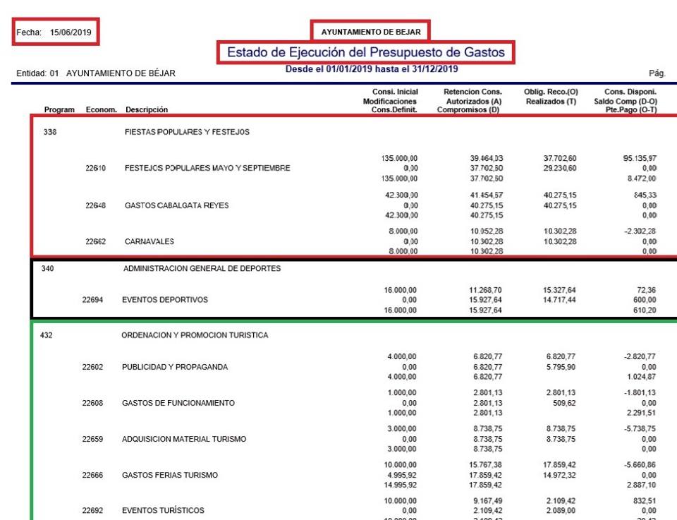 Con esta información y fecha en la que se constituyó el ayuntamiento se observa que la partida de fiestas ha quedado con 95.000 euros (El pasado año se gastaron unos 150.000 euros). Según estos datos se habrían gastado 42.000 euros en la Cabalgata de Reyes y 10.000 euros en carnavales, cuando el dinero que habían presupuestado era de sólo 8.000 euros.