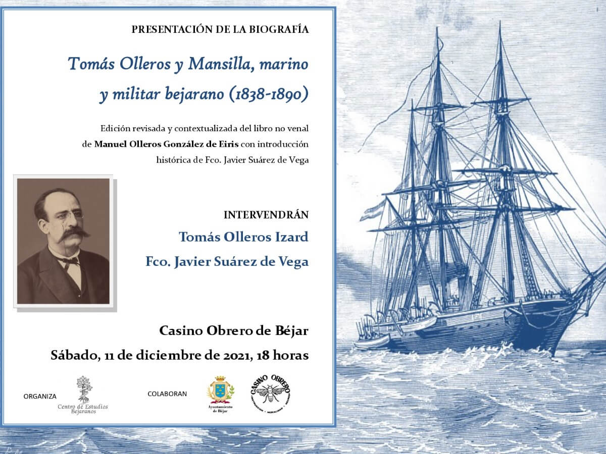 Una nueva publicación editada por el Centro de Estudios Bejaranos sale a la luz durante este mes y será presentada el sábado 11 de diciembre de 2021, en el Ateneo Cultural “Casino Obrero” de Béjar, a las 18 horas. Lleva por título Tomás Olleros y Mansilla, marino y militar bejarano (1838-1890) y es, en cierto modo, especial.