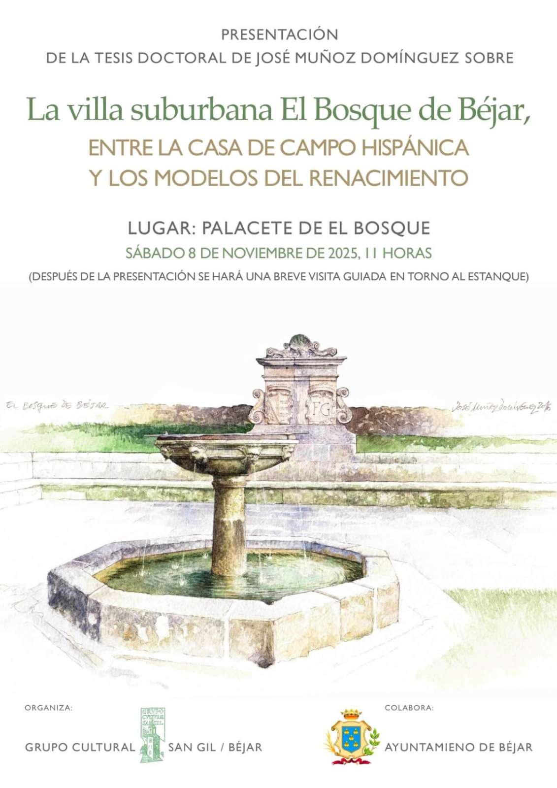 Este sábado 8 de noviembre a las 11:00 horas, el palacete del conjunto renacentista El Bosque de Béjar acogerá la presentación pública de la tesis doctoral de José Muñoz Domínguez, titulada “La villa suburbana El Bosque de Béjar, entre la casa de campo hispánica y los modelos del Renacimiento”. El acto está organizado por el Grupo Cultural San Gil con la colaboración del Ayuntamiento de Béjar.