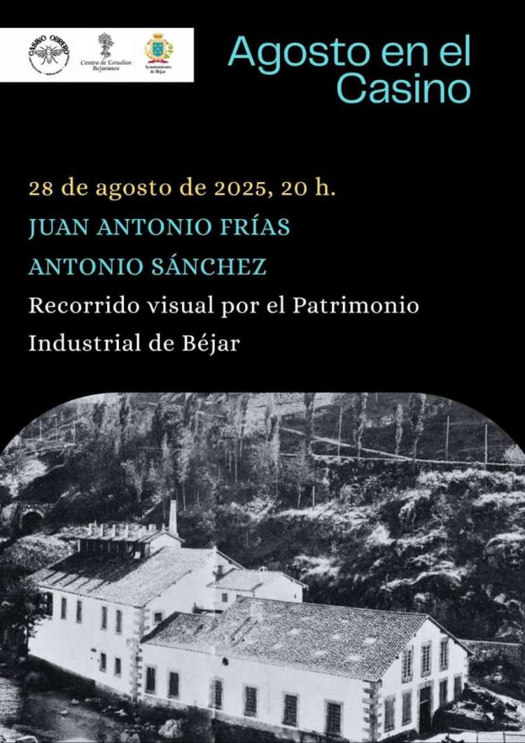 El próximo jueves 28 de agosto, a las 20:00 horas, el Casino Obrero de Béjar será el escenario del último acto del programa cultural “Agosto en el Casino”, organizado por el Centro de Estudios Bejaranos. En esta ocasión, se ofrecerá un recorrido visual por el patrimonio industrial de la ciudad, una propuesta que invita a la reflexión sobre la historia económica y arquitectónica de Béjar.