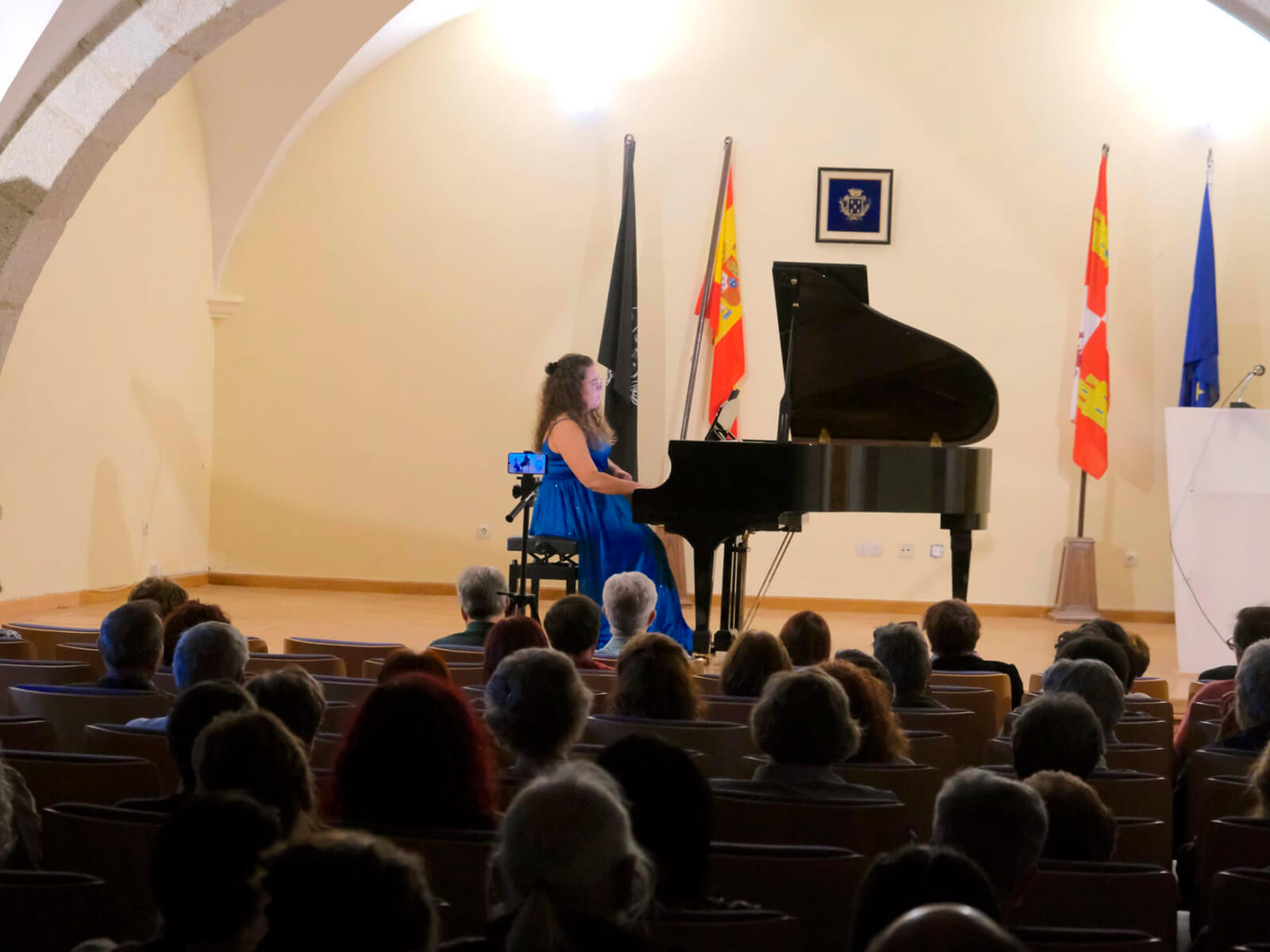 Al terminar, el público brindó una ovación de pie. La concejala de Cultura entregó a la pianista un ramo de flores como reconocimiento a su virtuosismo, mientras el CEB expresaba agradecimiento al Ayuntamiento por la colaboración institucional, a los intervinientes y al público asistente —entre ellos, la ex concejala de Cultura Purificación Pozo García.