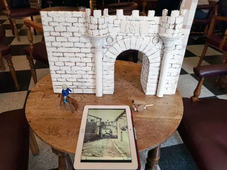 La maqueta, que cuenta con una reproducción a escala de la puerta y de los edificios colindantes, se ha elaborado con materiales de reciclaje: cartón, yeso, pintura y envases, y se completa con los populares clicks de Playmobil encarnando a los personajes que participaron en los sucesos: José Fronsky, Domingo Guijo y Vicente Valle, entre otros.