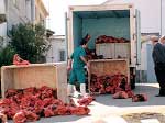 Durante toda la jornada de ayer un camión frigorífico de gran tonelaje permaneció frente a la iglesia y las viviendas de algunos vecinos, interrumpiendo también el acceso a los domicilios. El trasvase de un camión a otro de los productos, derivados de animales sacrificados en el matadero, riñones específicamente, fueron esparcidos de forma accidental frente al parque del barrio. Se trata de uno de los efectos que los vecinos de Palomares soportan desde la conversión del matadero de municipal a industrial, conversión que recientemente ha condenado la justicia dando la razón a los vecinos en contra de la licencia concedida por el propio alcalde.