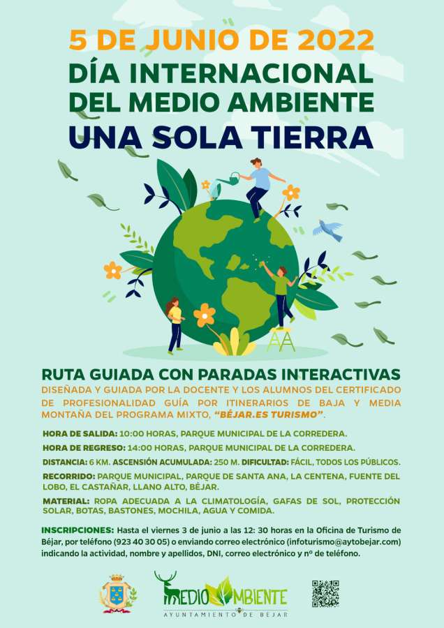 El próximo domingo, 5 de junio, se celebra el Día Mundial del Medio Ambiente, declarado por primera vez por la ONU en 1973. Este año el lema elegido por Naciones Unidas, es "Una sola Tierra", y desde el Ayuntamiento de Béjar se unen a esta celebración internacional ofreciendo una ruta interactiva por lugares significativos de la ciudad, con talleres para conocer diferentes aspectos ambientales que pueden ayudarnos a cuidar nuestro entorno.