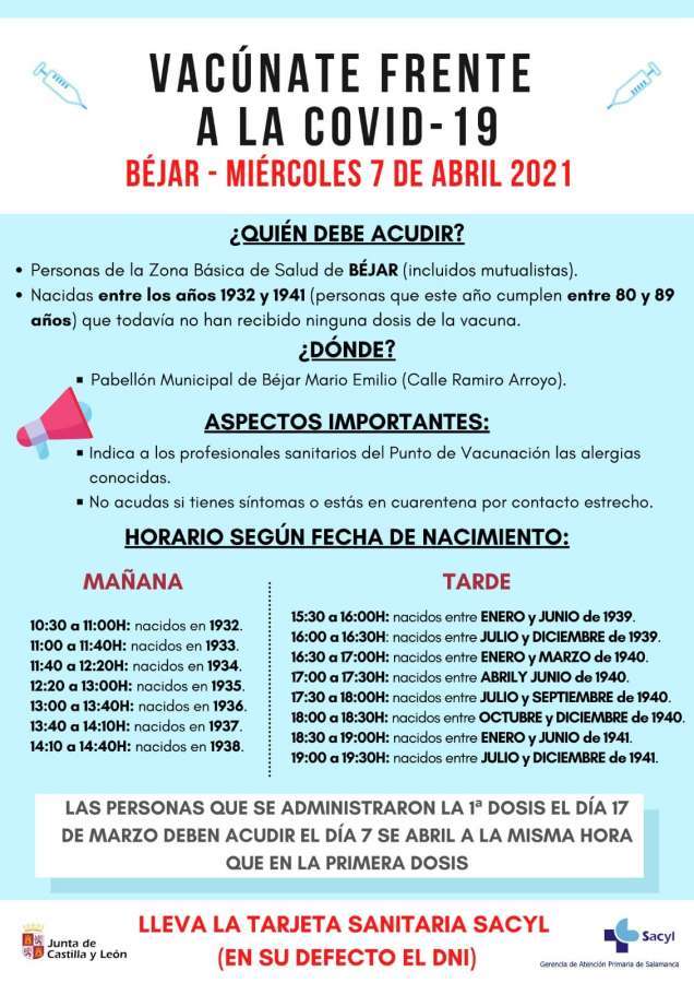 Todas las personas nacidas entre los años 1932 y 1941 que todavía no han recibido ninguna dosis están llamados a vacunarse este miércoles, 7 de abril, en el pabellón municipal de Béjar.