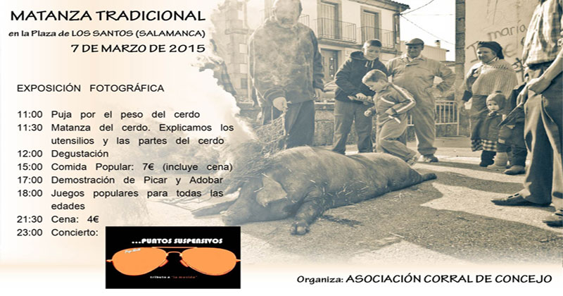 La Asociación Corral Concejo, de la localidad de Los Santos ha organizado una nueva jornada de la Matanza Tradicional que tendrá lugar el 7 de marzo. La cita se iniciará a las 11 de la mañana con la puja por el peso del cerdo. A continuación tendrá lugar la tradicional matanza.