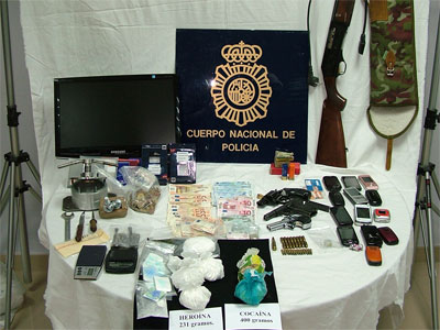 En los registros los efectivos policiales incautaron 400 gramos de cocaína, 231 gramos de heroína, útiles de prensado para las sustancias estupefacientes, una escopeta de caza, un revólver y dos pistolas de diferente calibre. Igualmente se decomisaron aproximadamente 2000 Euros repartidos en billetes de cincuenta, veinte, diez euros y moneda fraccionada.