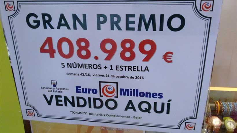 El sorteo del Euromillones celebrado ayer, viernes, ha dejado 408.989,59 euros en Béjar. El boleto galardonado con el segundo premio (5+1) fue vendido en el despacho de loterías "TORQUES, bisutería y complementos" situado en la Estación de Autobuses de Béjar.