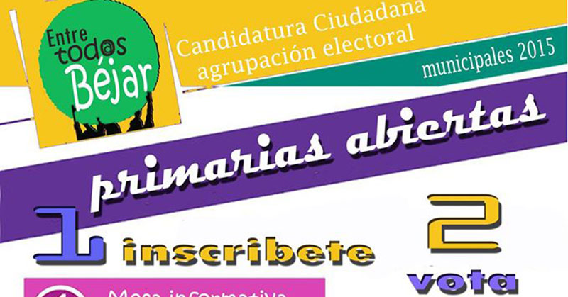 La agrupación electoral " Entre Todxs Béjar" pone en manos de los ciudadanos/as la elección de los candidatos/as a las municipales mediante primarias abiertas. Tú Decides, es el lema con el que se organizan las primarias abiertas en las que podrán participar todos los candidatos que se inscriban previamente.