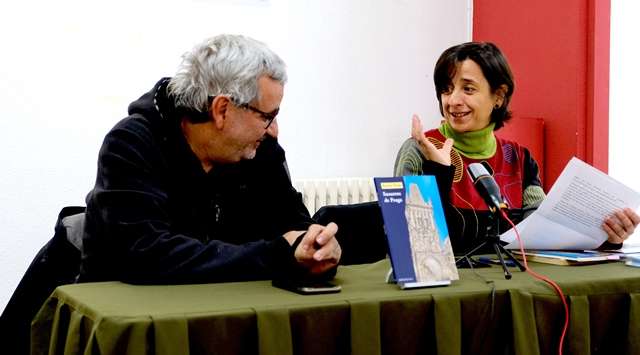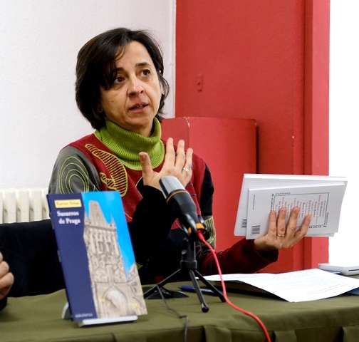 En una amena conversación, el autor y la editora, teniendo como hilo conductor el libro, comentaron por medio de una serie de preguntas y respuestas distintos aspectos, como por ejemplo el embrujo que para el bejarano le supone Praga, ciudad en la que vive en distintas épocas del año. Y también la posible influencia de escritores checos como Kafka, aspecto que se intuye en el nombre elegido para la protagonista del libro. No dejaron de lado los elementos autobiográficos y de la historia personal de Frías Conde, e incluso las formas que tiene de plasmar su inmensa creatividad. Destacable es también el diseño de la cubierta, una creación que tiene como centro la Torre de la Pólvora, cuya autora es la propia hija del escritor, Laura Frías Viana.