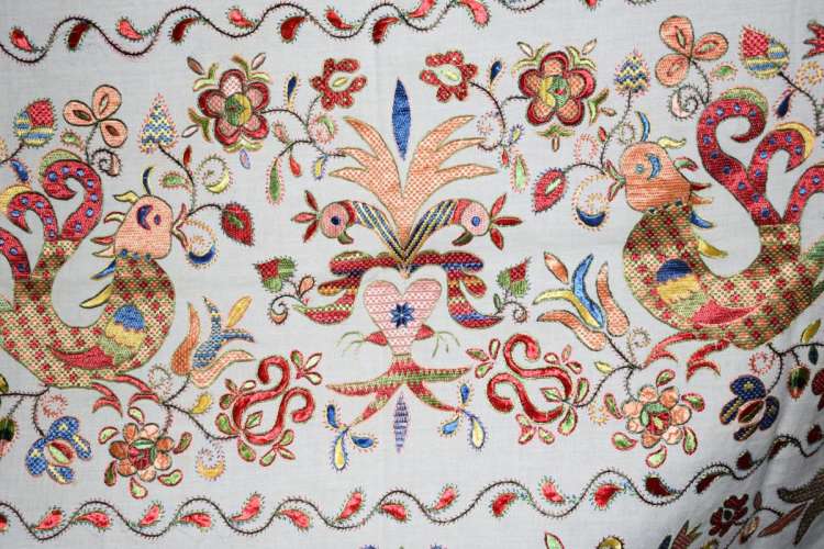Las piezas de la imagen que acompaña a esta información corresponden a otra de las mujeres bordadoras que aún quedan en la Sierra de Francia, Pilar Martín de Mogarraz. Entusiasta del Bordado y de la aplicación de sus motivos en los talleres de Estandartes Serranos que se han desarrollado en la localidad.
