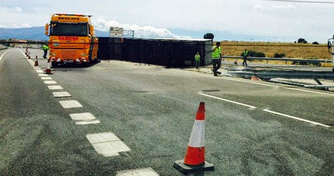 La Guardia Civil se ha visto obligada a cortar el tráfico durante un tiempo, ya que el camión volcó ocupando los dos carriles de la vía. No hay que lamentar daños personales
