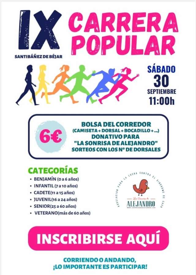 La localidad de Santibáñez de Béjar se prepara para celebrar la novena edición de su carrera popular "¡Corre por una buena causa!", una prueba solidaria que tendrá lugar el sábado 30 de septiembre a las 11:00 horas. El evento espera reunir a numerosos corredores de todas las edades en un esfuerzo conjunto en beneficio de La Sonrisa de Alejandro, asociación para la lucha contra el síndrome de CACH.