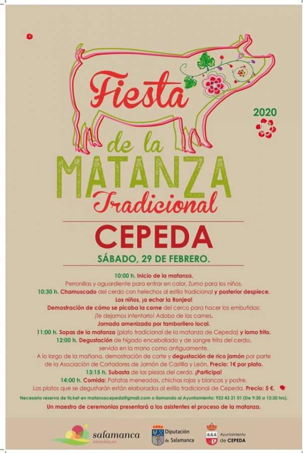 - 14:00 h. Comida: Patatas meneadas, chichas rojas y blancas y postre. Los platos que se degustarán están elaborados al estilo tradicional de Cepeda. Precio: 5 € Necesario reserva de ticket en matanzacepeda gmail.com o llamando al Ayuntamiento: 923 43 21 01 (De 9:30 a 13:30 hrs).