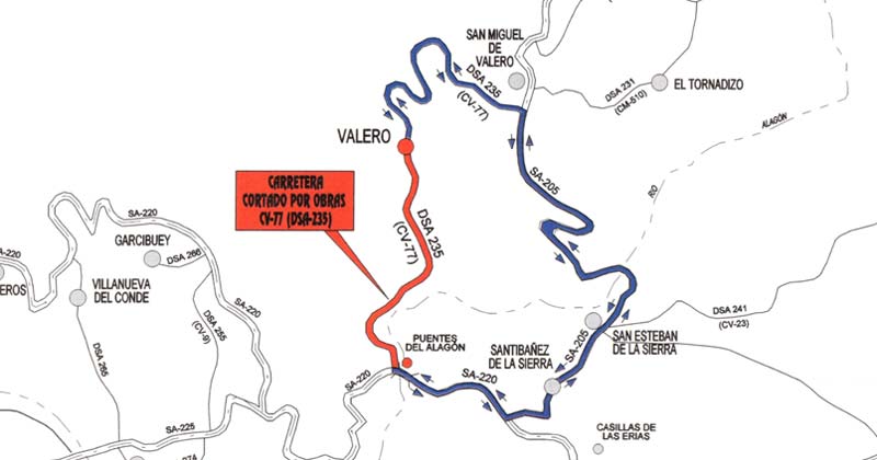 Con motivo de las obras de acondicionamiento de la carretera DSA-235, de Puentes del Alagón a Valero, promovida por la Diputación de Salamanca dentro de los planes de inversión de carreteras, dicho tramo de carretera permanecerá cerrado al tráfico de vehículos del 22 de junio al 7 de agosto de 2015.