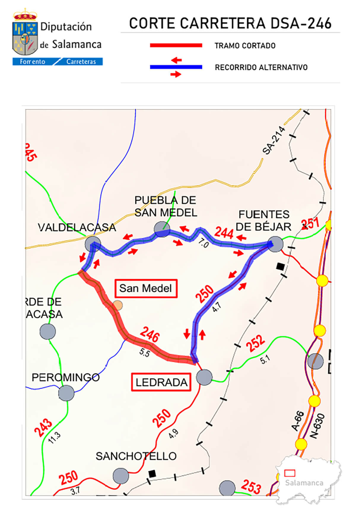 El desvío recomendado discurre por los municipios de Fuentes de Béjar y Puebla de San Medel, a través de las carreteras DSA-250 y DSA-244, según la señalización habilitada para facilitar la circulación en la zona afectada.