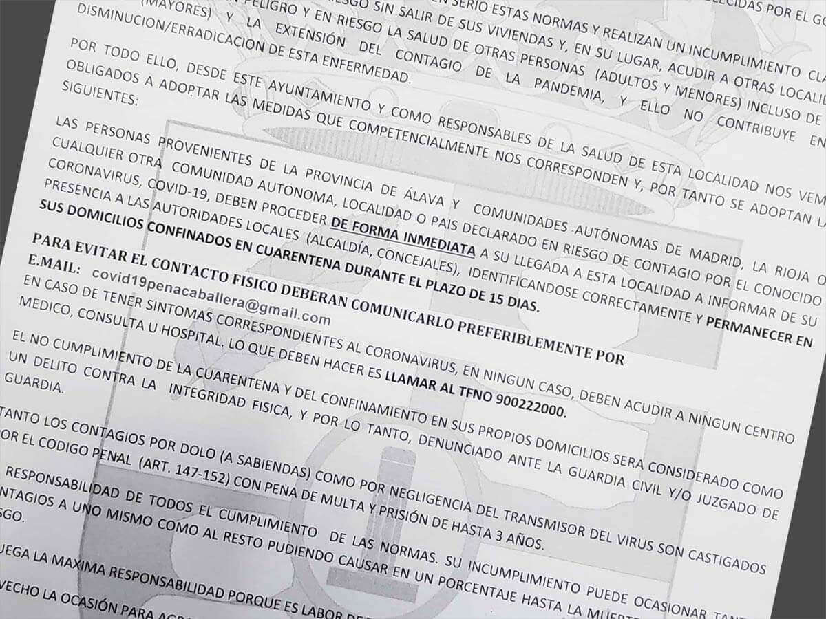 El Ayuntamiento de Peñacaballera ha emitido un edicto denominado de "vital importancia" ante la propagación del COVID-19. El alcalde, Javier Valencia, informa de las medidas que se han puesto en marcha desde el consistorio con el fin de minimizar el impacto de la enfermedad en la localidad y proteger la salud de las personas.