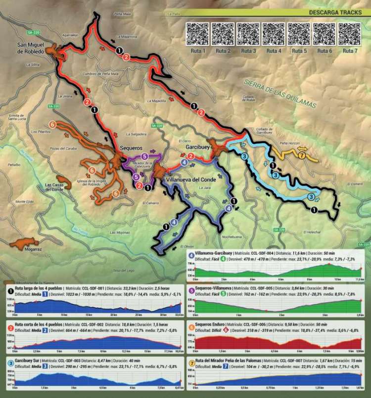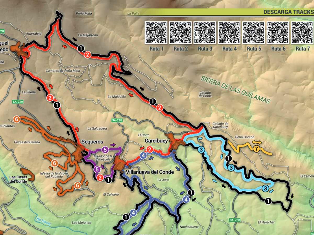 En concreto, se han creado una ruta de ida y vuelta y seis rutas circulares: una de dificultad alta, cuatro medias y una fácil. Los amantes de la bicicleta de montaña podrán conocer durante su recorrido los cascos urbanos declarados Conjuntos Históricos de los municipios de Sequeros y de Villanueva del Conde, así como poblaciones de gran belleza como San Miguel de Robledo o Garcibuey con sus murales de arte urbano.